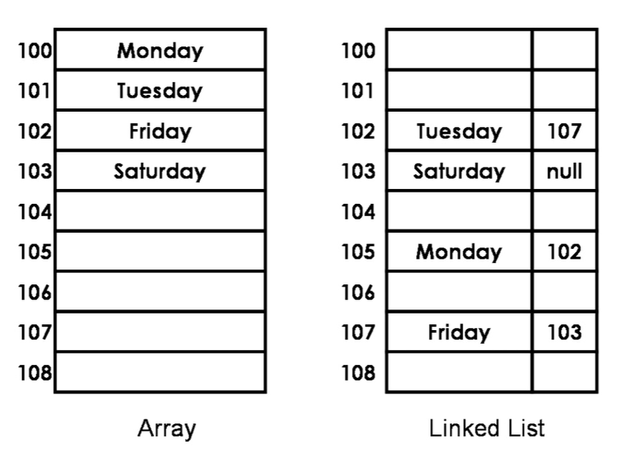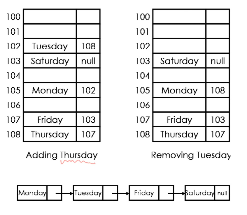 연결리스트는 데이터와 다음 데이터의 주소를 묶어서 저장한다. 즉 105번지에 Monday와 2번째 데이터인 Tuesday의 주소값102가 묶여서 저장된 것을 알 수 있다.