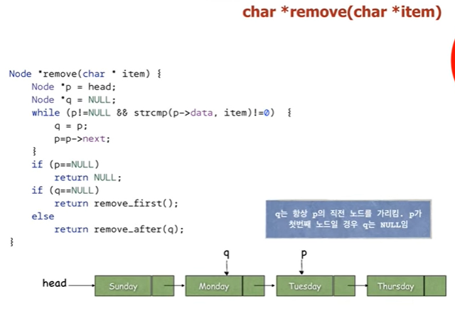 포인터 변수 q를 새롭게 만들어 p가 한칸 앞으로 계속 전진하기 직전에 p를 q에 저장하여 그 전 노드의 주소를 계속 기억하게끔 하는것 입니다.