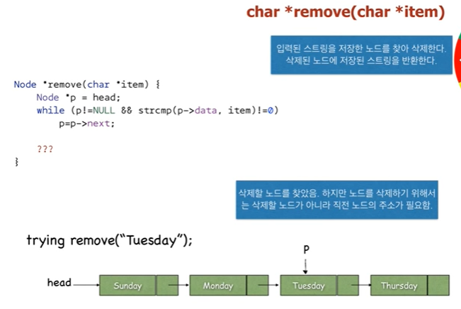 위 코드는 노드를 가리키는 p와 p가 가리키는 노드의 데이터가 인자로 입력받은 데이터와 같은지 비교하는 구문입니다. 이다음에서 문제점이 일어나는데 우리가 어떤 데이터를 삭제하려면 그 전 노드의 주소가 필요합니다. 왜냐하면 그 전 노드의 next필드에 다음 노드의 주소의 정보가 필요하기 때문이죠 즉, ??? 줄에는 이러한 주소를 알수있게하는 방법이 필요합니다.