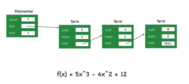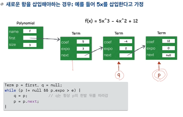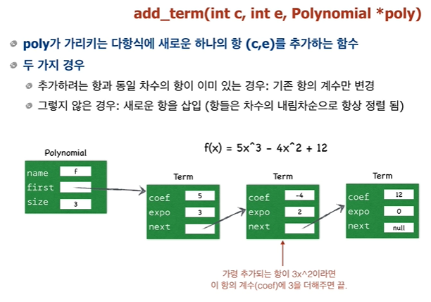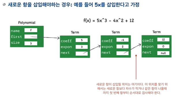 - 다항식을 항들의 연결 리스트로 표현한다.