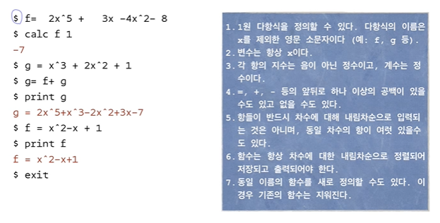 연결리스트를 활용하여 다항식의 문제를 푸는 계산기를 만들어봅시다. 이때, 계수는 정수이고 지수는 양의 정수라고 가정하겠습니다.