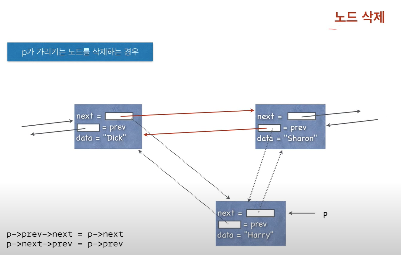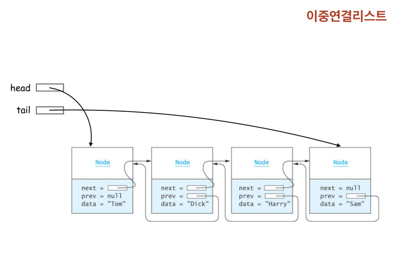 - 각각의 노드가 다음(next)노드와 이전(previous)노드의 주소를 가지는 연결 리스트