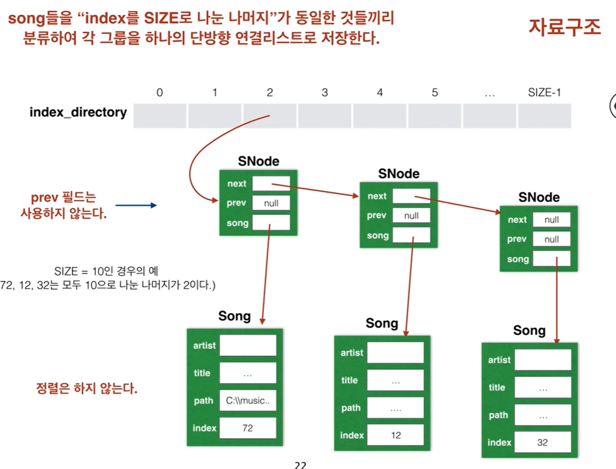이처럼 번거롭게 자료구조를 편성한 이유는 즉, 노드와 데이터를 분리하는 이유는 노래들에 대해서 다양한 접근경로를 제공하기 위해서입니다. 예를들어 가장최근에 들었던 노래들의 목록을 만들고자 할대 Artist에 대한 Song이 이미 연결리스트로 묶여있다면 특정한 Song을 하나씩 뽑아오기가 매우 번거롭기 때문입니다.