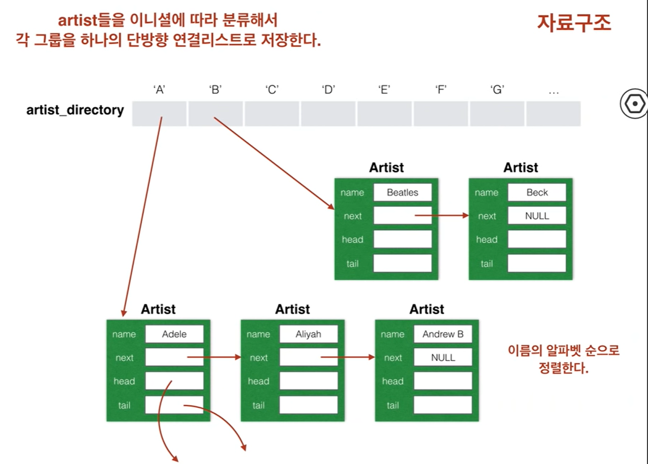 Artist가 여러명 존재함으로 artist들을 이니셜에 따라 분류해서 각 그룹을 하나의 단방향 연결리스트로 저장한다.
