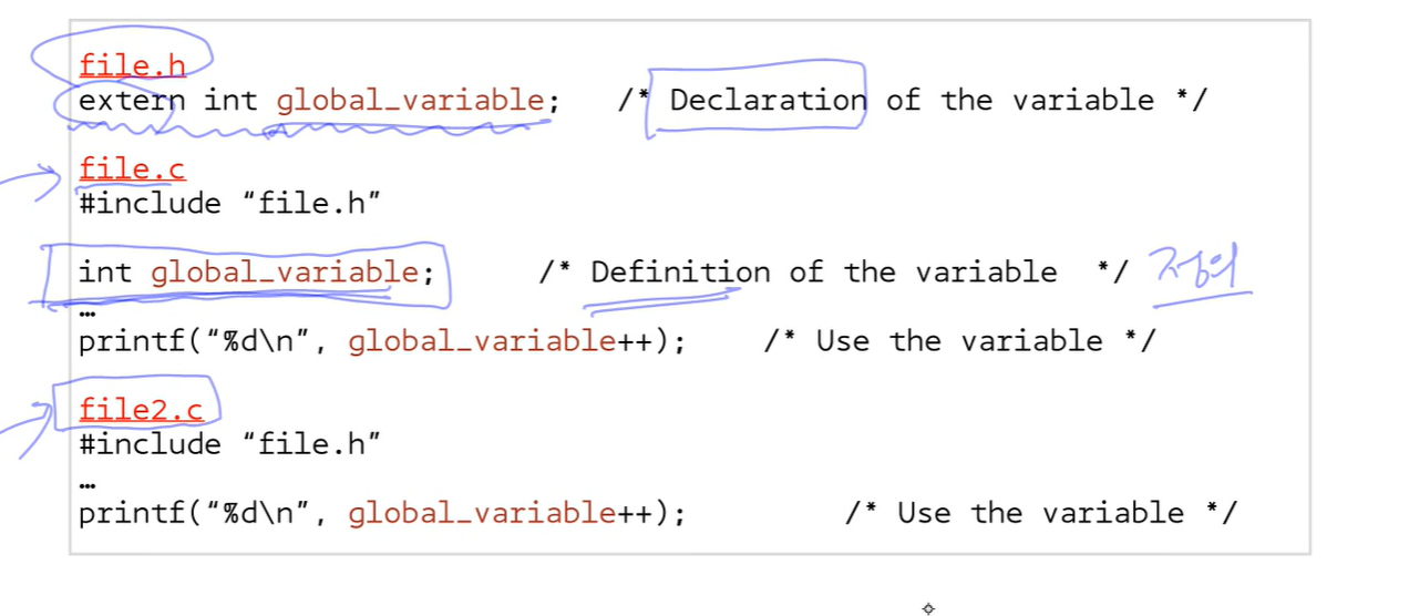 키워드 extern을 이용하여 변수를 정의하지 않고 선언만 할 수 있음. 즉, 컴파일러에게 변수i와 배열a가 다른 파일에 정의되어 있음을 알려주는 역할
