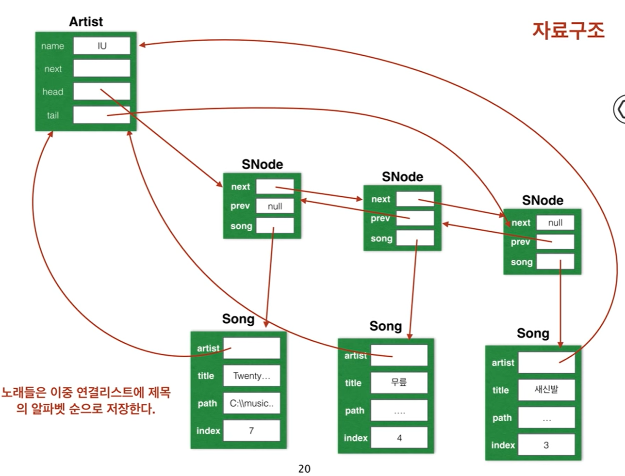이처럼 번거롭게 자료구조를 편성한 이유는 즉, 노드와 데이터를 분리하는 이유는 노래들에 대해서 다양한 접근경로를 제공하기 위해서입니다. 예를들어 가장최근에 들었던 노래들의 목록을 만들고자 할대 Artist에 대한 Song이 이미 연결리스트로 묶여있다면 특정한 Song을 하나씩 뽑아오기가 매우 번거롭기 때문입니다.