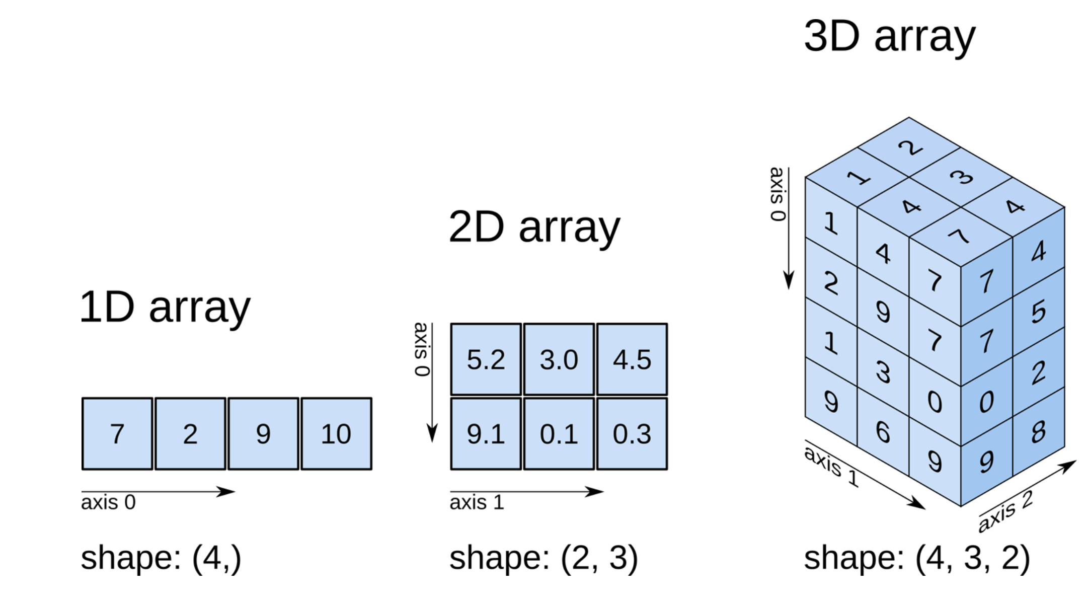 array1 과 array2의 차이는 무엇일까요? 1차원 배열인 array1는 3개의 데이터를 가지고 있는 반면 2차원 array2는 하나의 row , 3개의 column을 가지고 있습니다.(1행3열)