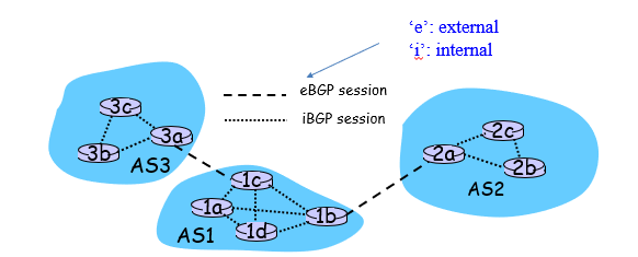 - 3a와 1c사이의 eBGP session을 통해 AS3는 prefix 도달가능 정보를 AS1에게 전송함