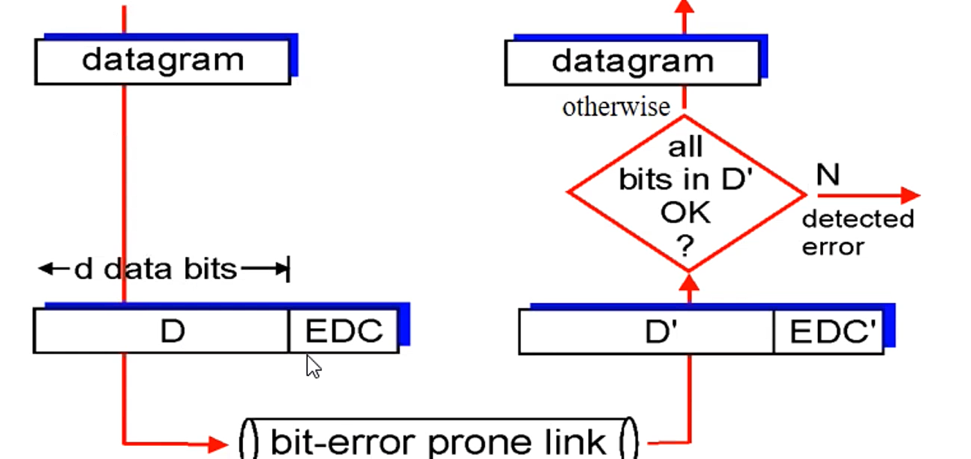 비트 오류를 방지하기 위해 송신 노드에서 데이터 D에 오류 검출 및 정정 비트(EDC)를 첨가한다. 수신자는 자신이 수신한D'과EDC'만으로 원래의 D가D'가 동일한지 결정한다.