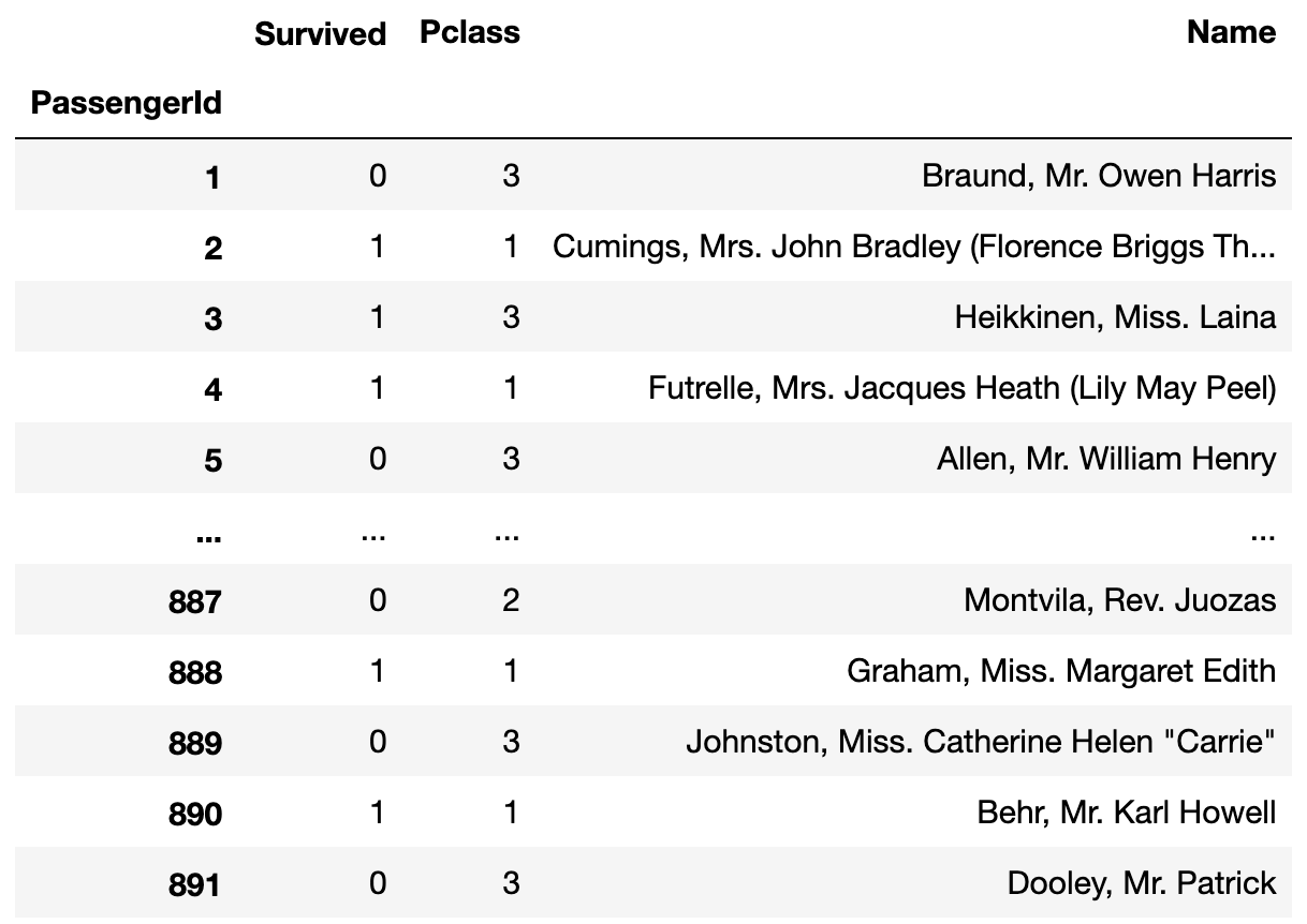 train_data = pd.read_csv('train.csv', index_col='PassengerId', usecols=['PassengerId', 'Survived', 'Pclass', 'Name'])