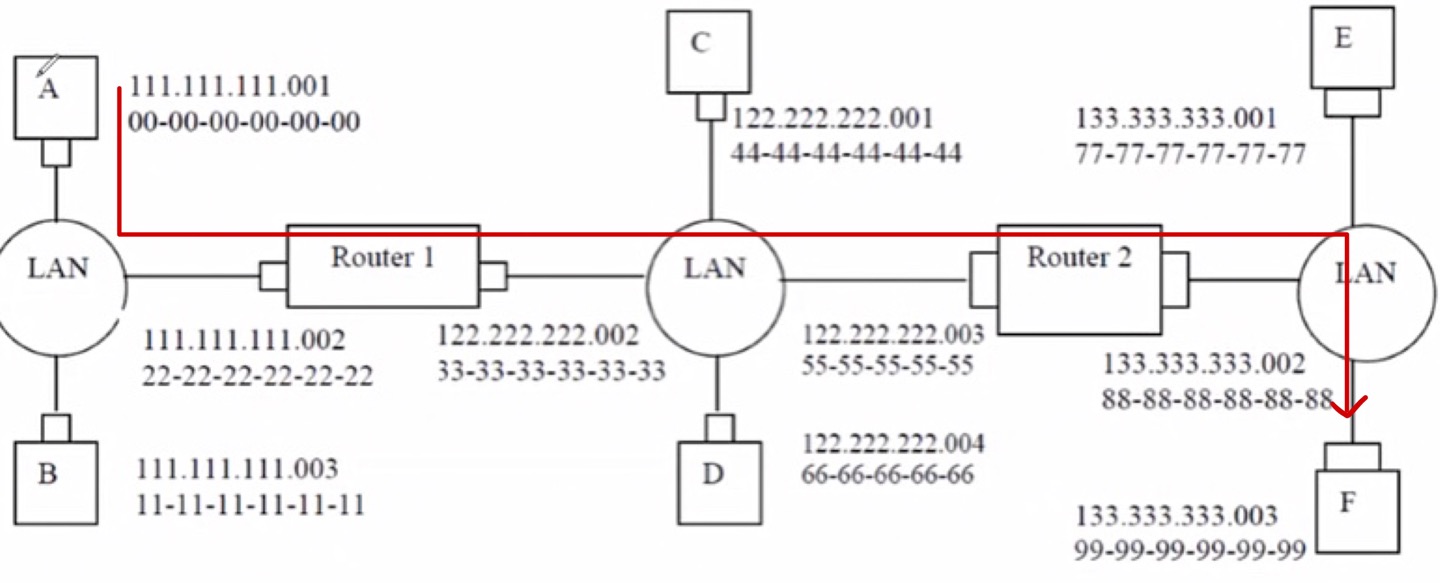 datagram이 A에서 F로 이동하는동안 MAC주소는 바뀌는 반면 IP주소는 동일합니다.