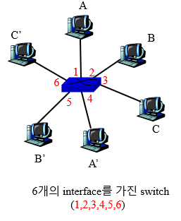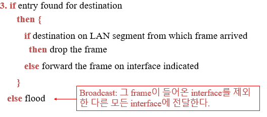 - 입력되는 frame의 MAC주소를 검토하여, 선택적으로 frame을 한 개의 link혹은 다수의 출력 link에 전달함