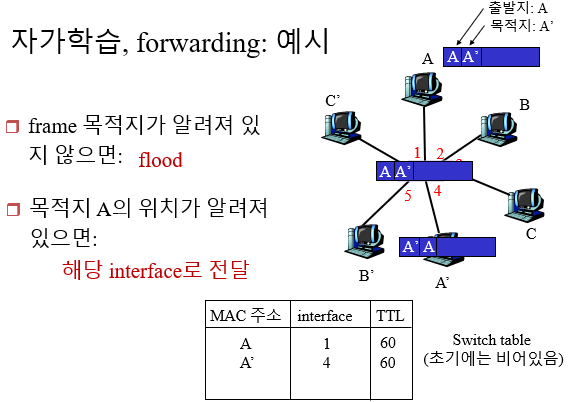 Q : Switch는 어떻게 interface4를 통해 A'에 접속 가능하고, interface5를 통해 B'에 접속 가능한 것을 아는가?