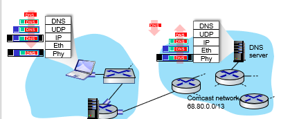 - DNS query 생성, UDP로 캡슐화, IP로 캡슐화, Ethernet으로 캡슐화. 게이트웨이로 프레임 전송하기 위해, 게이트웨이 인터페이스의 MAC주소 필요함 : ARP