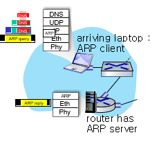 - ARP query broadcast, 게이트웨이가 수신, 게이트웨이가 인터페이스의 MAC주소를 주는 ARP reply로 응답함.