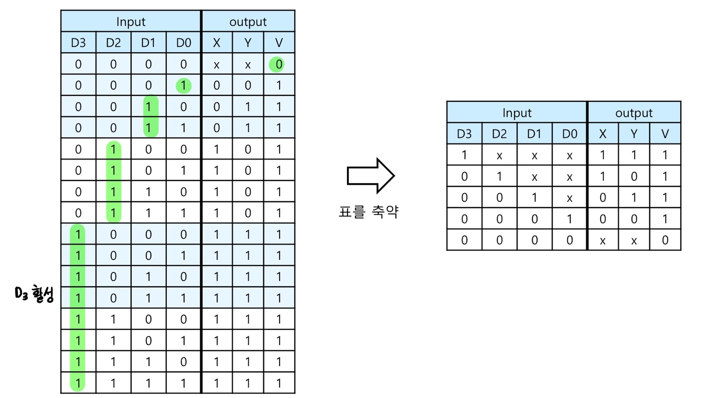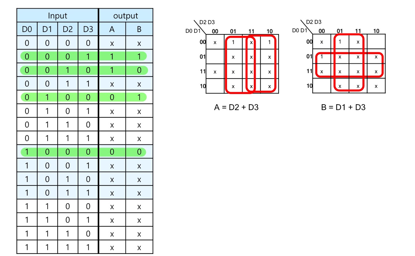 - D3, D2, D1모두 0이고 D0가 1이면 출력은 00