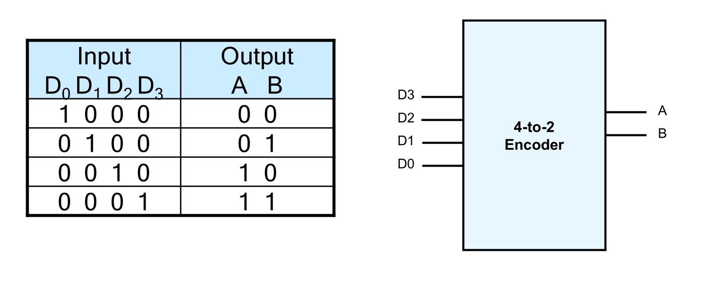 - 4 to 2 인코더의 경우 실제 입력은 16가지 조합입니다.