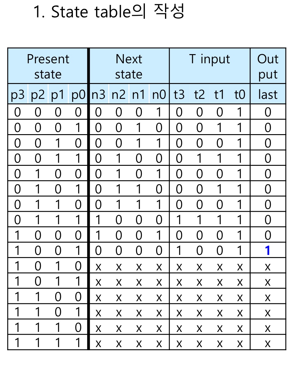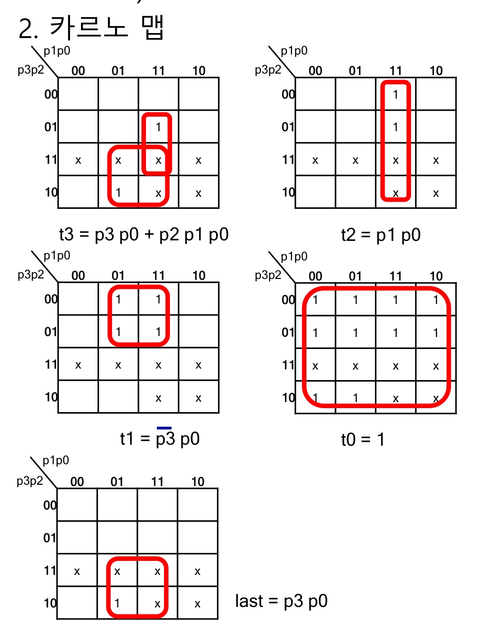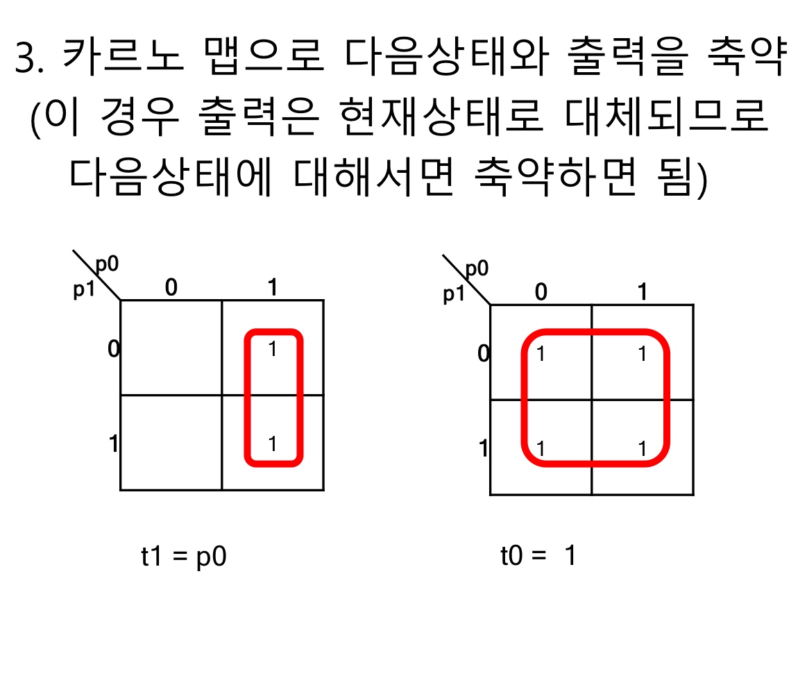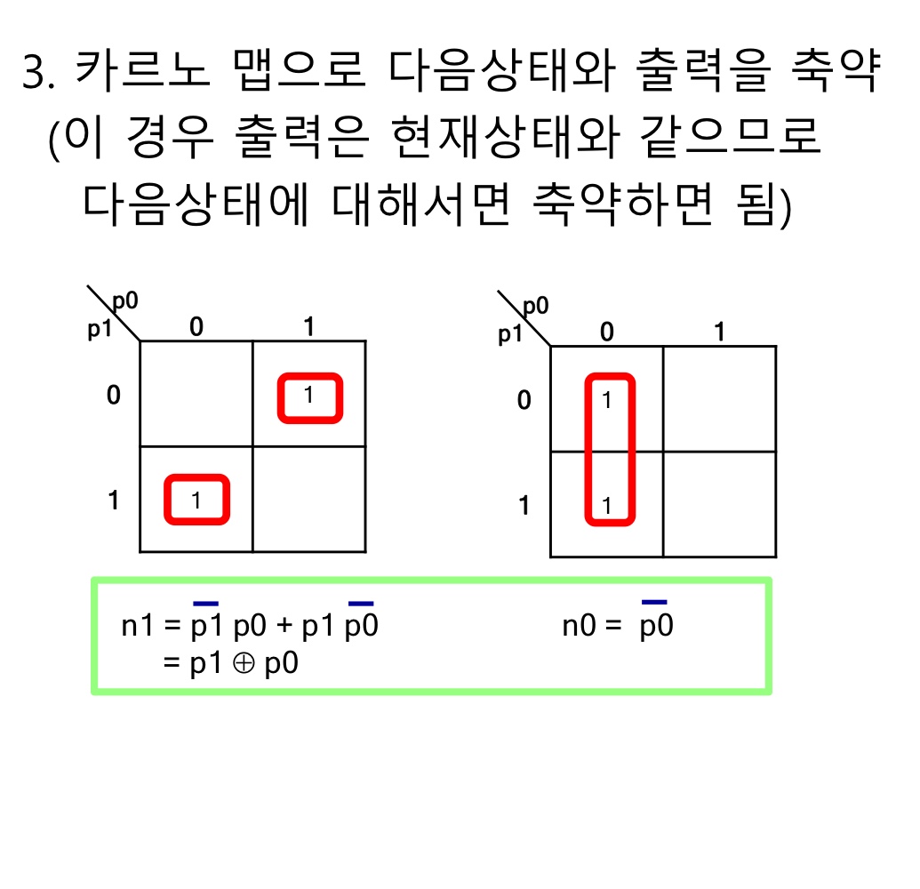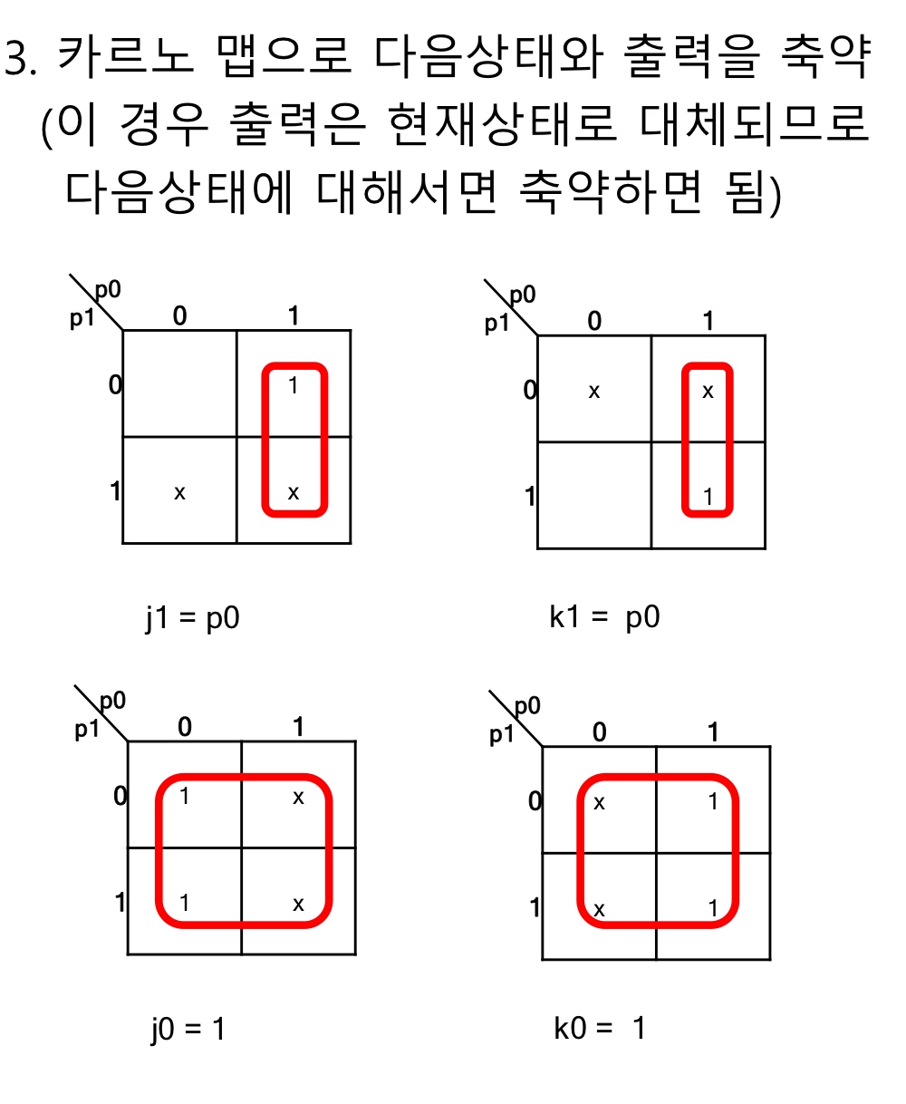 3. 다음상태와 출력신호를 카르노맵으로 축약한다.