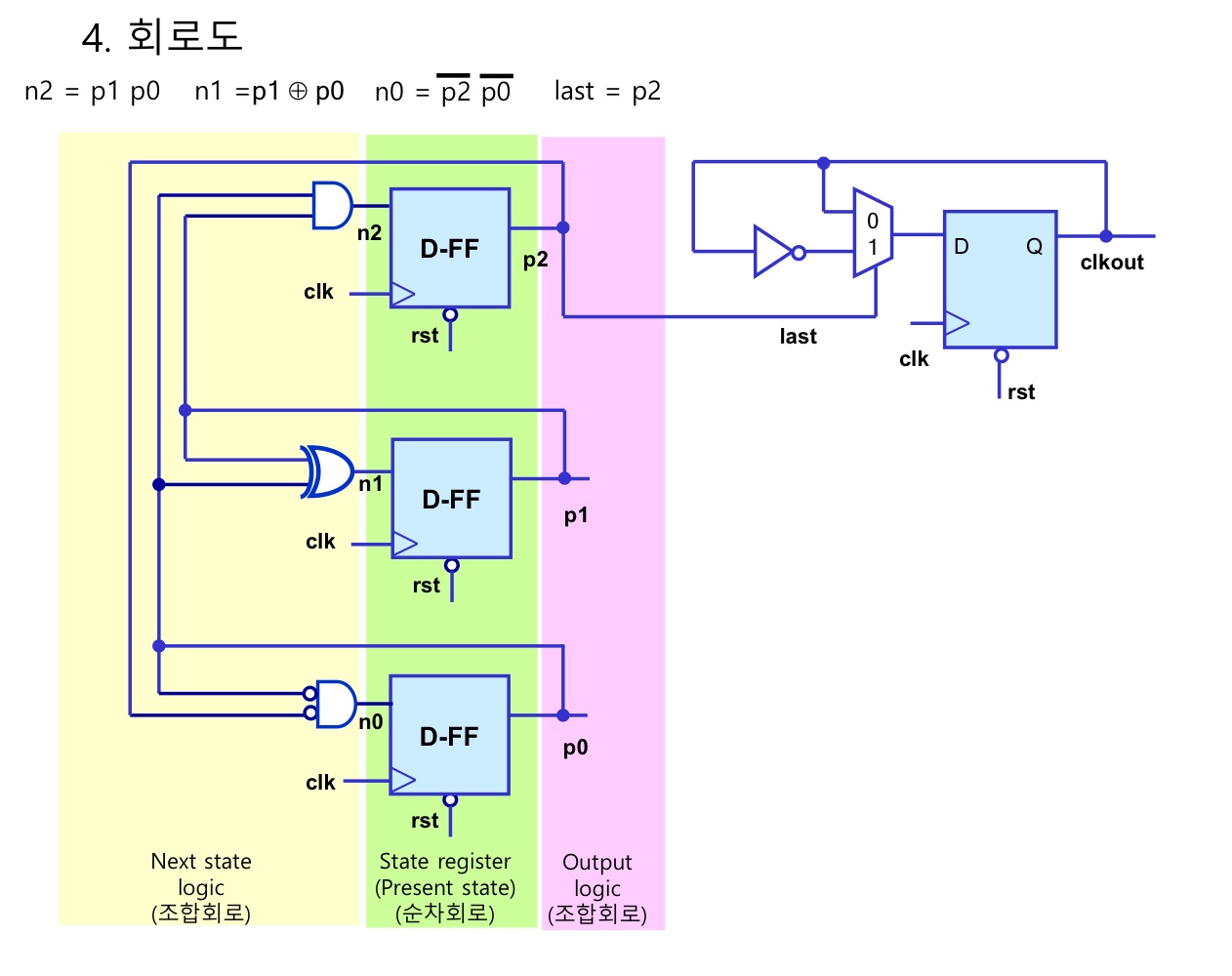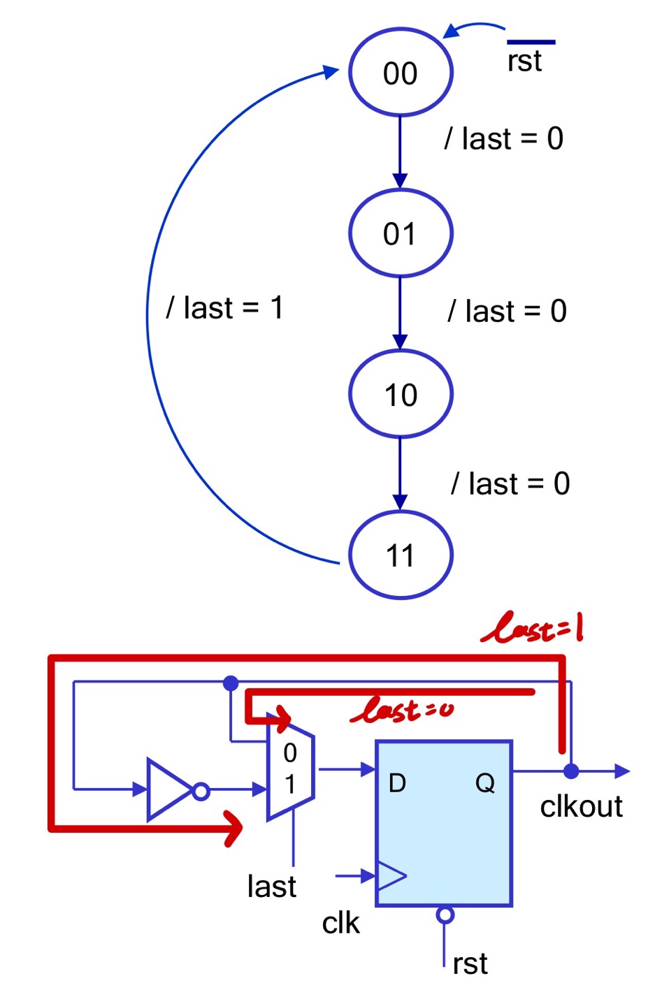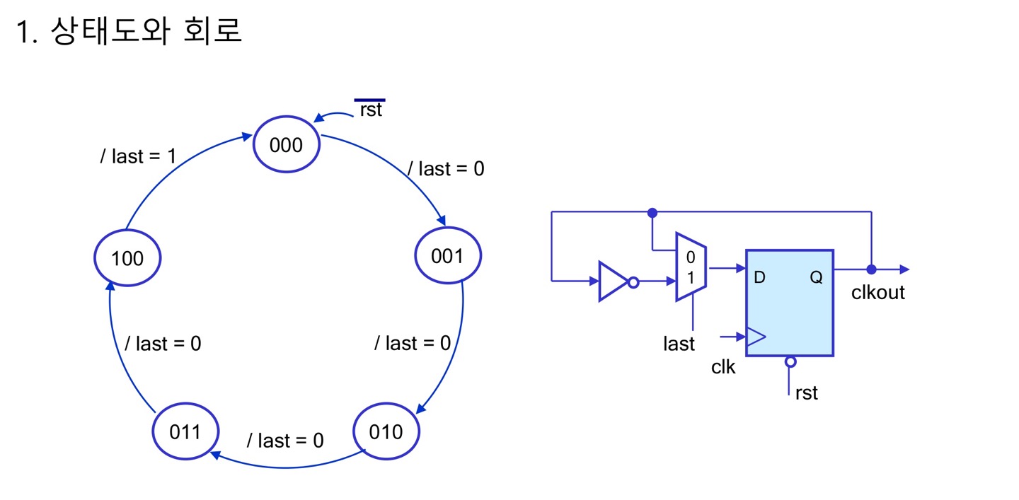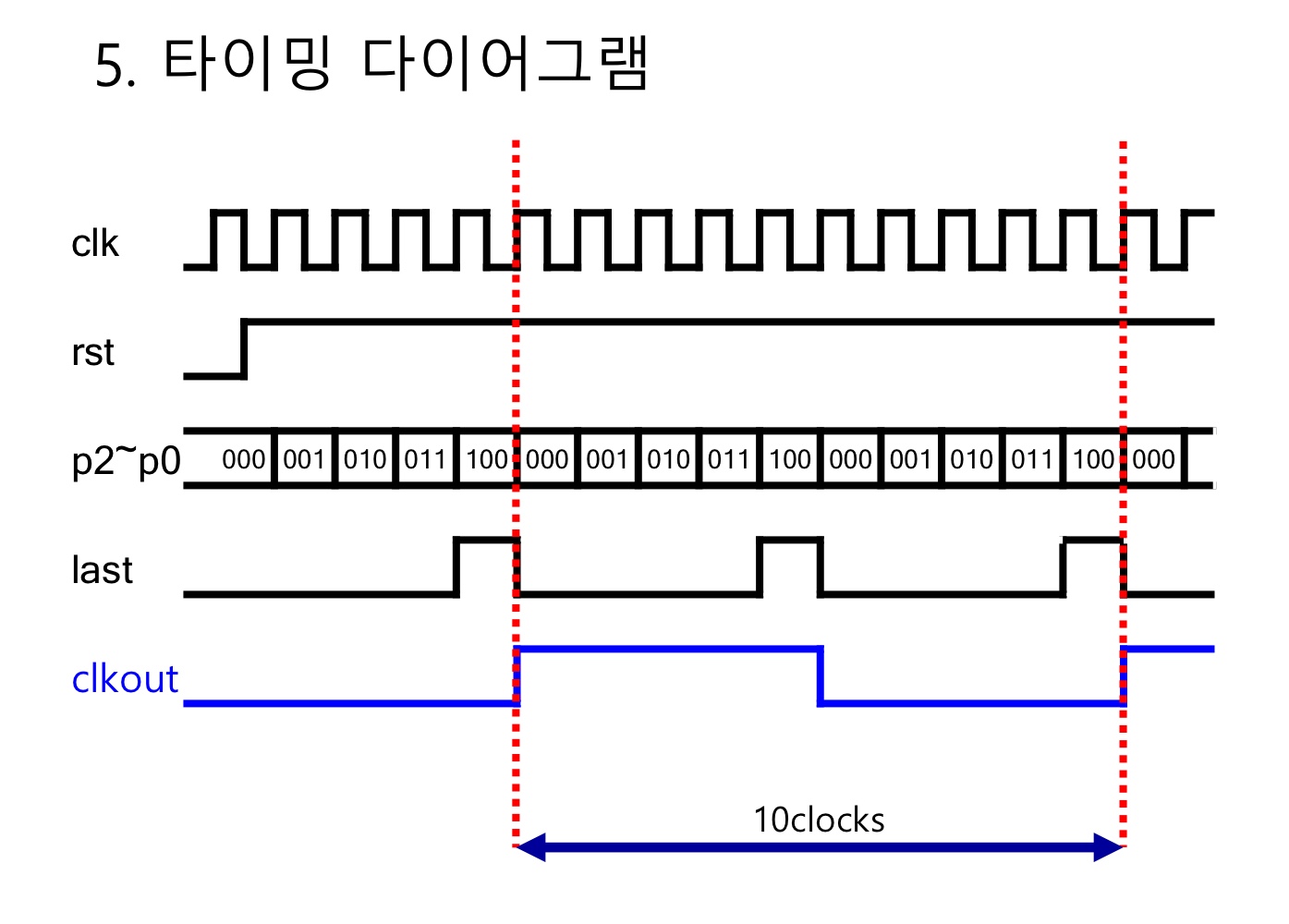 - 100이 되었을 때만 last=1이고 다음 클럭에서 clkout반전됨
