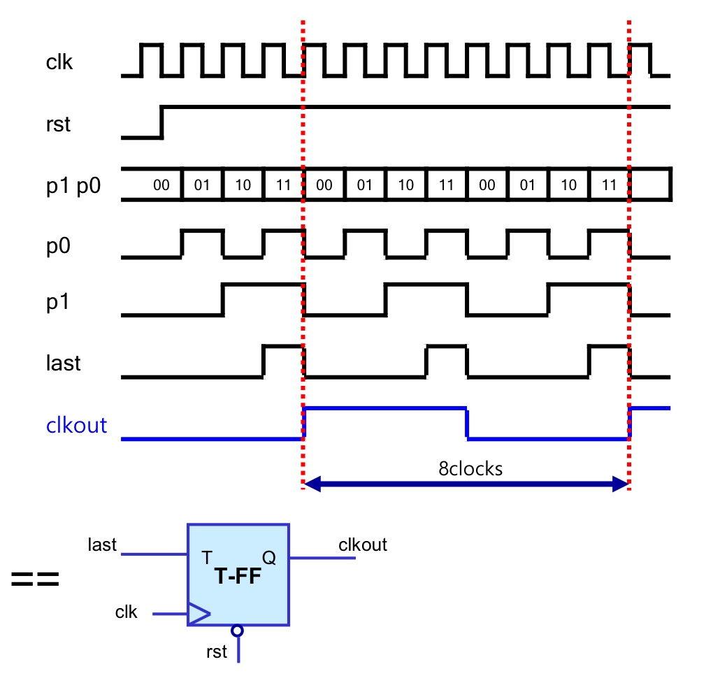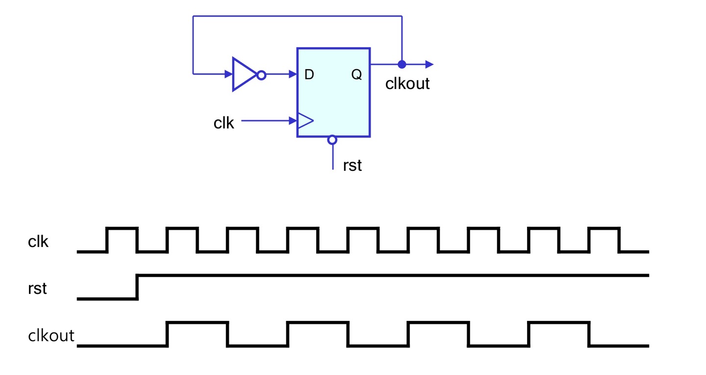- 매 클럭 에지마다 값을 바꾸기 때문에 입력 클럭을 2분주한 클럭을 발생