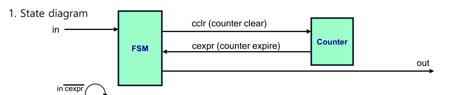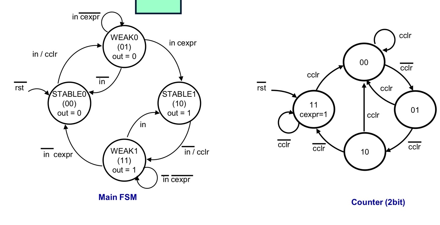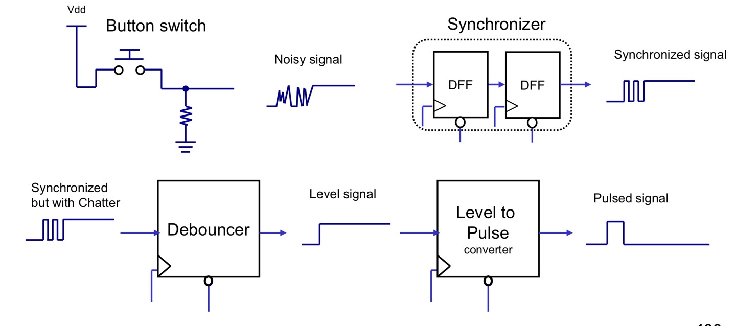 - Debouncer : 기계적 진동때문에 1이나 0으로 안정된 값을 바로 갖지 못하므로 이러한 채터(chatter)또는 바운스(bounce)를 제거한다.