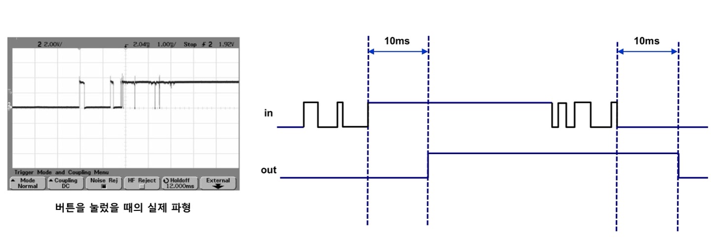 - 버튼을 누르면 기계적 진동 등으로 여러 번 0에서1로, 1에서 0으로 바뀌는 bounce현상이 발생한다.