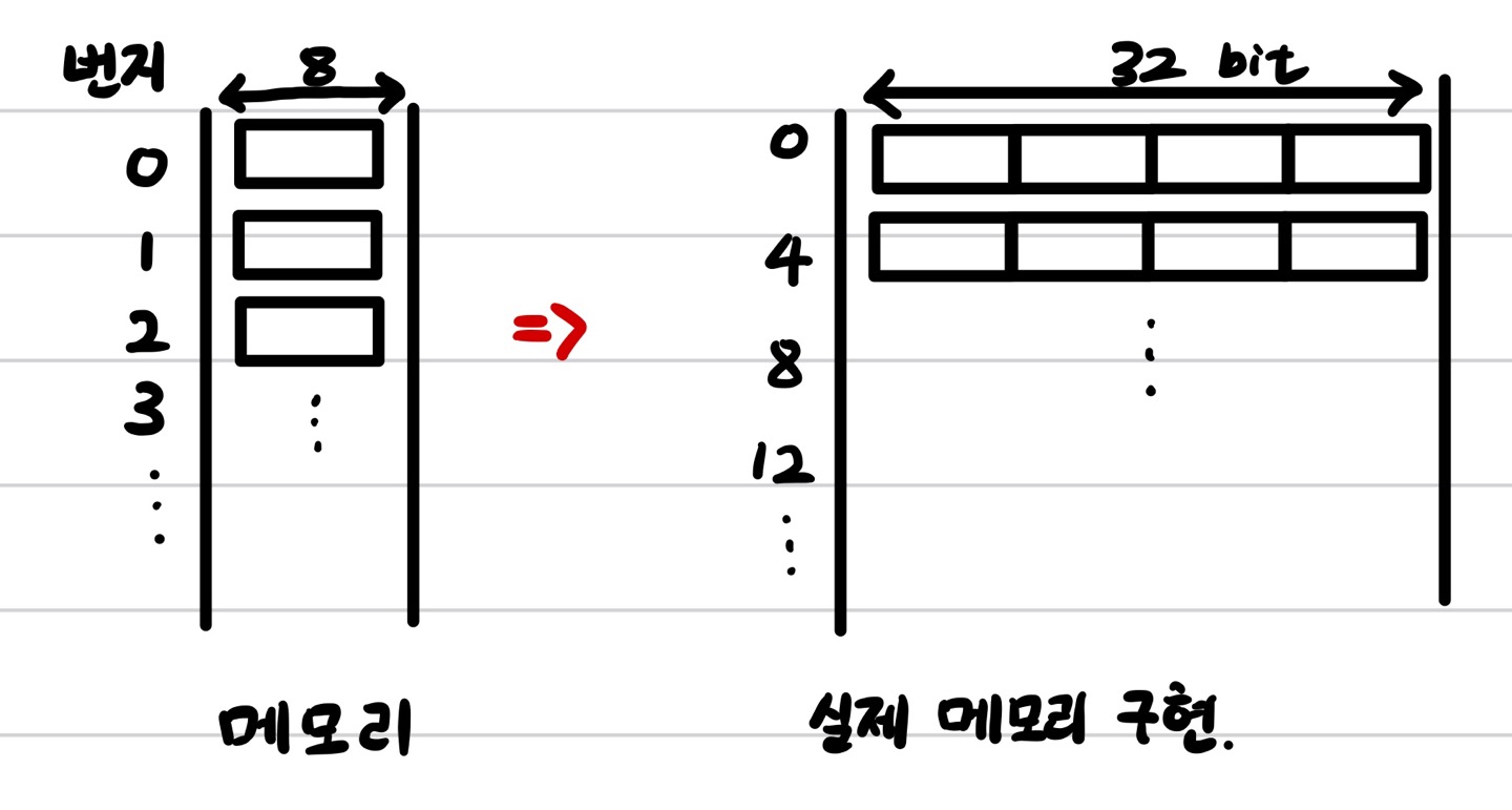메모리는 8비트에 하나씩 번지수가 증가하여 구성되지만 실제는 다릅니다. 메모리에 word를 저장해야되는데 이 word의 크기가 32bit이기 때문입니다. 즉, 메모리 한칸에 32bit로 구성해야 합니다. 그래서 4번지를 한꺼번에 사용하여 실제 메모리를 구현합니다. 이를 words가 메모리에 aligned되어 있다라고 말합니다. 그래서 번지수는 무조건 4의 배수이죠.