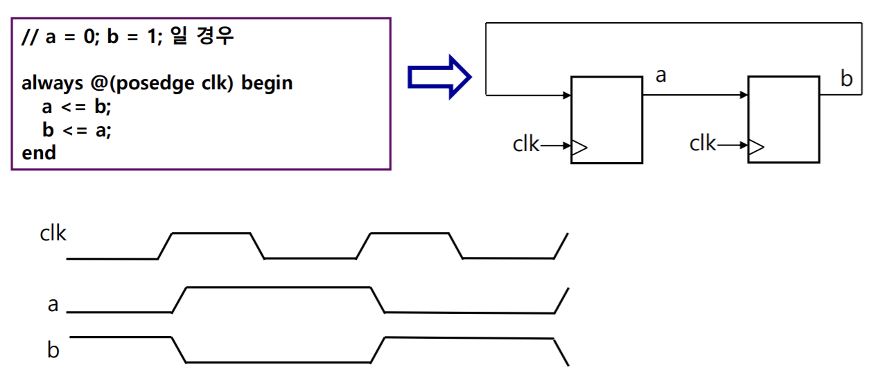 - nonblocking 할당문 : 할당기호 <= 를 사용합니다. nonblocking 문장끼리는 동시에 실행됩니다.