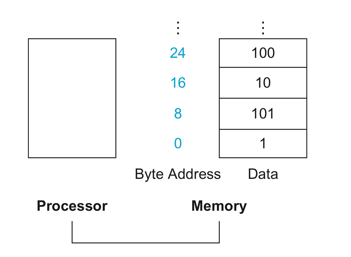 프로그램에서 8비트로 구성된 바이트를 많이 사용하므로 대부분의 컴퓨터는 바이트 단위로 주소를 지정한다. 워드 주소는 워드를 구성하는 4바이트 주소 중 하나를 사용한다. 그러므로 연속된 워드의 주소는 4씩 차이가 난다. 다음 그림의 실제 MIPS주소를 보여줍니다.
