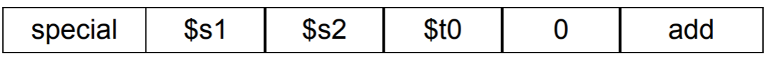 명령어의 각 부분을 필드(field)라 부릅니다. 처음과 마지막 필드는 더셈에 사용할 첫 번째 레지스터 번호, 세 번째 필드는 두 번째 피연산자 레지스터 번호를 나타냅니다. 네 번째 필드는 계산 결과가 들어갈 레지스터의 번호입니다. 이 명령어에서 다섯 번째 필드는 사용되지 않으므로 0으로 표시했습니다. 종합하면 이 명령어는 레지스터 $s1을 레지스터 $s2에 더해서 그합을 레지스터 #t0에 넣으라는 뜻입니다. 이 명령어의 각 필드 값을 이진수로 표시하면 다음과 같습니다.