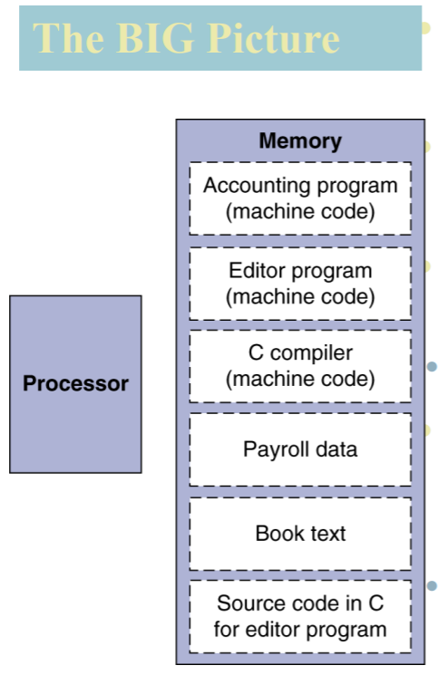 이것이 내장 프로그램의 개념이고 이 개념을 발명한 덕에 컴퓨터가 눈부시게 발전할 수 있었습니다. 밑 그림은 내장 프로그램의 장점을 보여 줍니다. 메모리에는 편집기가 편집 중인 소스코드, 컴파일된 기계어 프로그램, 실행 프로그램이 상요하는 텍스트 데이터, 심지어는 기계어를 생성하는 컴파일러까지도 기억 될 수 있습니다.