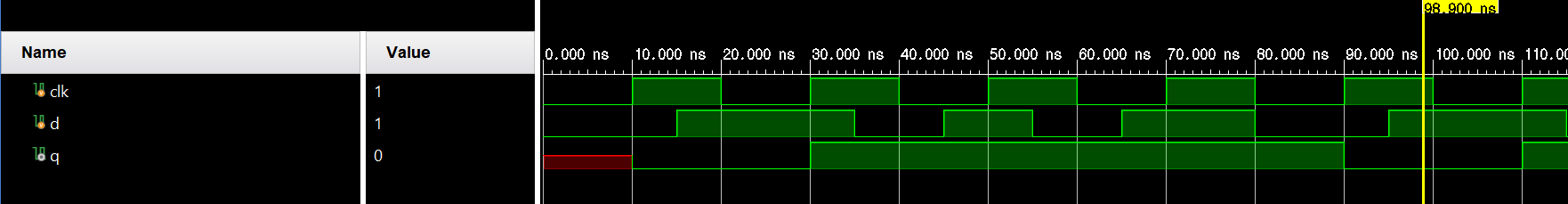 always구문 내부에 두 개의 nonblocking,blocking 할당문을 통해 q,q_bar를 생성하는데 q,q_bar가 모두 플립플롭의 출력이 되며, 두개의 플립플롭이 합성된다. 두 경우 모두 클럭의 상승에지에서 동작하고 q_bar는 q의 반전값을 출력하므로, 컽으로 보기에 회로는 올바르게 동작하지만, 1비트의 정보를 저장하기 위하여 2개의 플립플롭을 사용하는것은 비효율적이다.