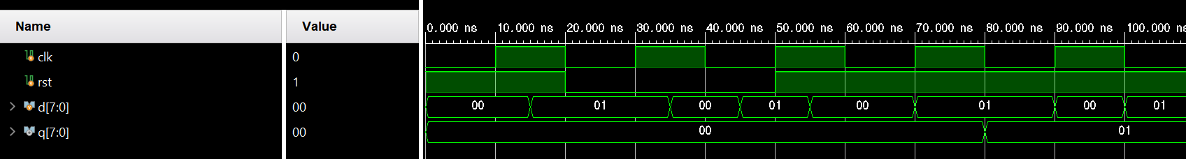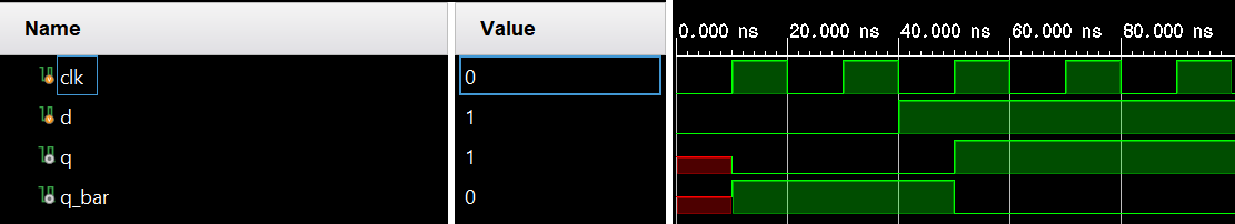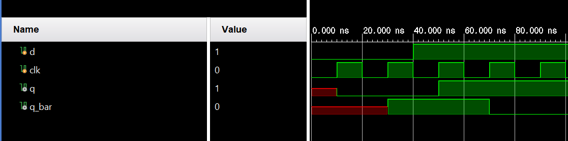 q_bar에 nonblocking 할당문 ~q를 사용했다. 여기서 발생하는 문제점은 첫번째 nonblocking할당문에서 q에 d가 들어가기전 q의 값이 두번째 nonblocking할당문으로 들어가야하는데 이값은 아직 정해지지 않은 값이다. 그래서 q_bar가 q에 비해 더 긴 X(unkowun)값을 지늬고 있다. 또한 계속해서 그 이전의 q값이 q_bar에 들어가기때문에 q_bar가 q에 늦게 들어가는 형태의 시뮬레이션을 보이고 있다.