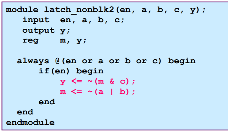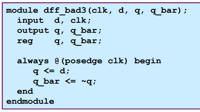 ★ 다음 코드는 nonblocking할당문의 순서를 바꾼 경우이다. 바꾸기 전 회로와 동일한 회로인지, 만약 다른 회로라면 어떤 회로가 되는지 시뮬레이션과 합성을 통해 확인하고, 그 이유를 생각해본다.