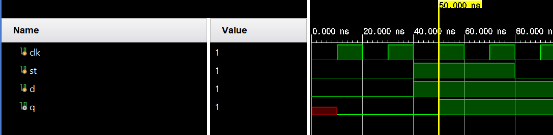 q_bar에 nonblocking 할당문 ~q를 사용했다. 여기서 발생하는 문제점은 첫번째 nonblocking할당문에서 q에 d가 들어가기전 q의 값이 두번째 nonblocking할당문으로 들어가야하는데 이값은 아직 정해지지 않은 값이다. 그래서 q_bar가 q에 비해 더 긴 X(unkowun)값을 지늬고 있다. 또한 계속해서 그 이전의 q값이 q_bar에 들어가기때문에 q_bar가 q에 늦게 들어가는 형태의 시뮬레이션을 보이고 있다.