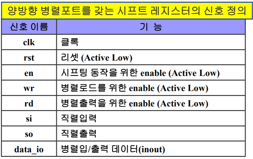데이터의 병렬로드(wr=0)와 시프팅 동작(en=0)이 동시에 일어나지 않으며, data_io포트가 inout이므로 rd신호와 wr신호가 동시에 0이 되지 않는다.
