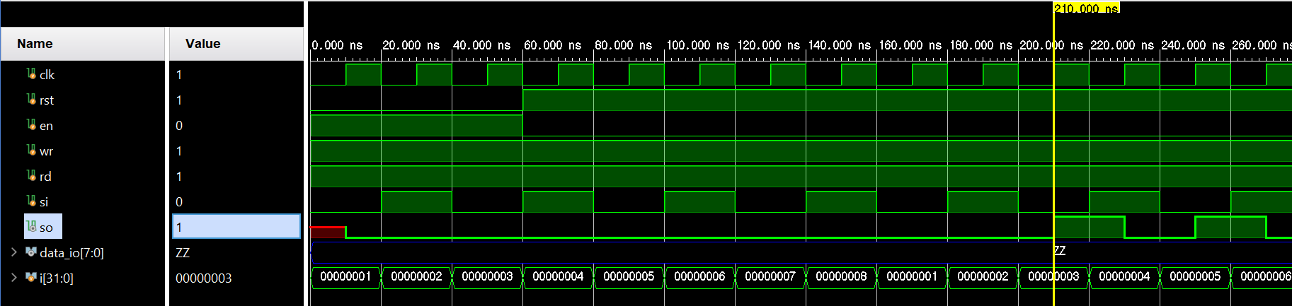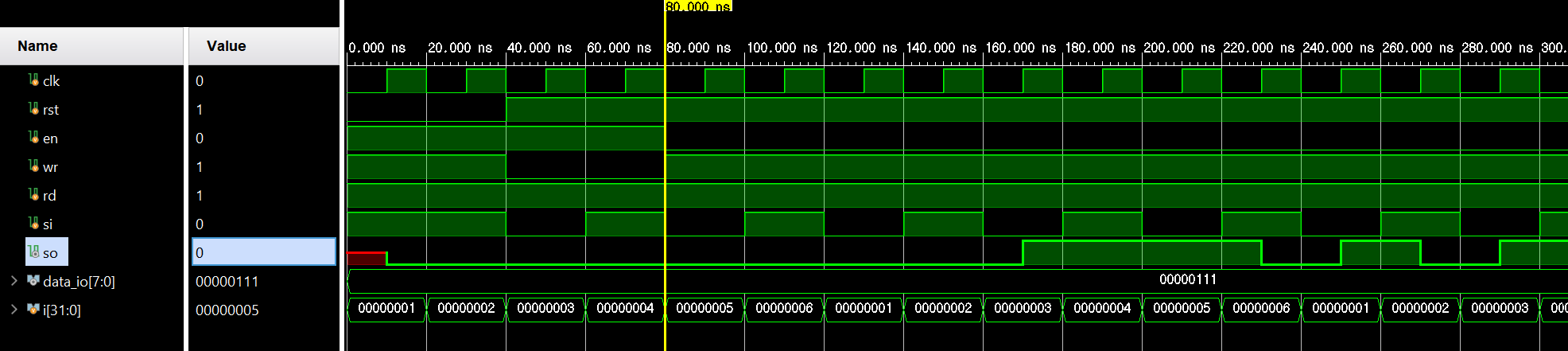 clk = 1'b0; rst = 1'b0; en = 1'b1; wr = 1'b1; rd = 1'b1; si =1'b1;