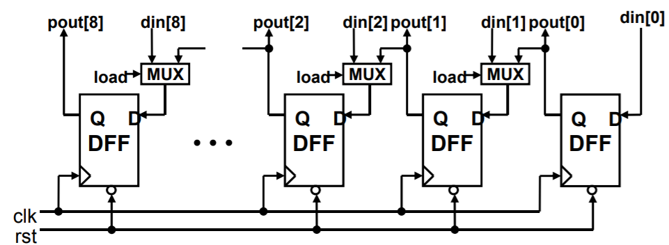 다음은 active-low 동기식 reset을 갖는 병렬입력-병렬출력 시프트 레지스터이다. load=1이면 8비트 데이터 din이 병렬로 레지스터에 입력되고, load=0이면 시프트 레지스터로 동작한다. 레지스터를 구성하는 각 플립플롭의 출력이 병렬로 pout에 출력된다. 다음과 같은 코드로 모델링 될 수 있으며, if(load)조건문이 사용되었으며, load=0인 경우에는 왼족 시프트 동작을 구현하기 위하여 논리시프트 연산자 <<가 사용되었다.