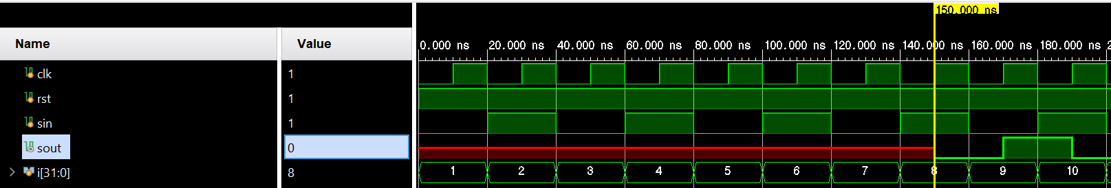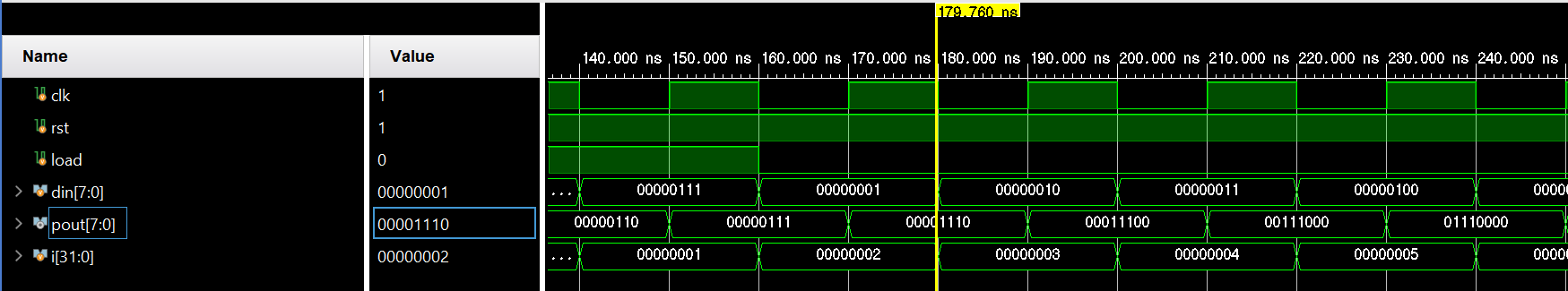 rst=0주어서 shift_reg초기화 시켜준 뒤 #40지연시간이 흐른 후 리셋을 풀어주고 wr=1'b0을 주어 병렬 로드 시킨다. 여기서 shift_reg값은 data_io값인 00001111의 값이 들어간다. 또 #40의 지연시간이 흐른뒤 부터 en=0으로 주어 병렬로드된 00001111값이 왼쪽으로 매 클럭마다 한킨씩 시프팅 되고 오른쪽은 si값이 계속해서 들어간다.