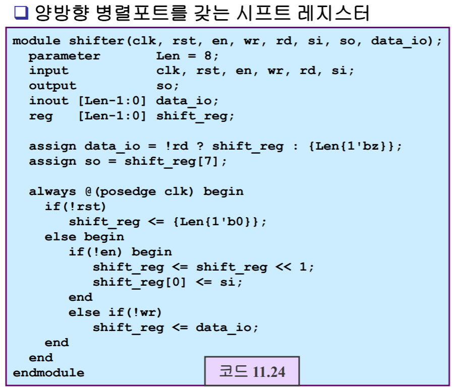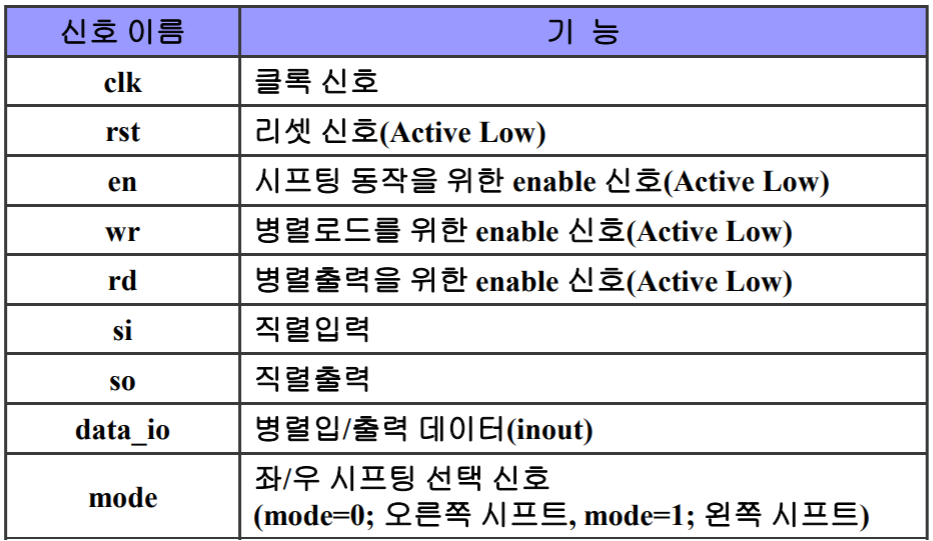 ★ 다음 코드에서 시프트 레지스터에 좌-우 시프팅 기능을 추가하여 설계하고, 시뮬레이션을 통해 동작을 확인한다. 신호의 기능은 다음표와 같으며, mode=0이면 오른쪽으로 시프팅되며, mode=1이면 왼쪽으로 시프팅되도록 설계한다.