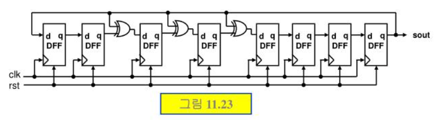 ★ 다음 그림의 8비트 LFSR회로를 모델링하고, 시뮬레이션을 통해 동작을 확인한다. 단, 플립플롭의 셋 또는 리셋은 active-low비동기식으로 이루어지도록 한다.