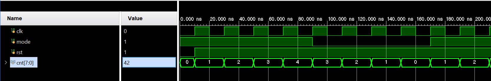 ★ Mode신호에 따라 계수기 값이 증가(mode=1) 또는 감소(mode=0)되는 8비트 증가/감소 계수기를 설계하고, 시뮬레이션을 통해 동작을 확인한다. active-low 비동기식 리셋을 갖는다.