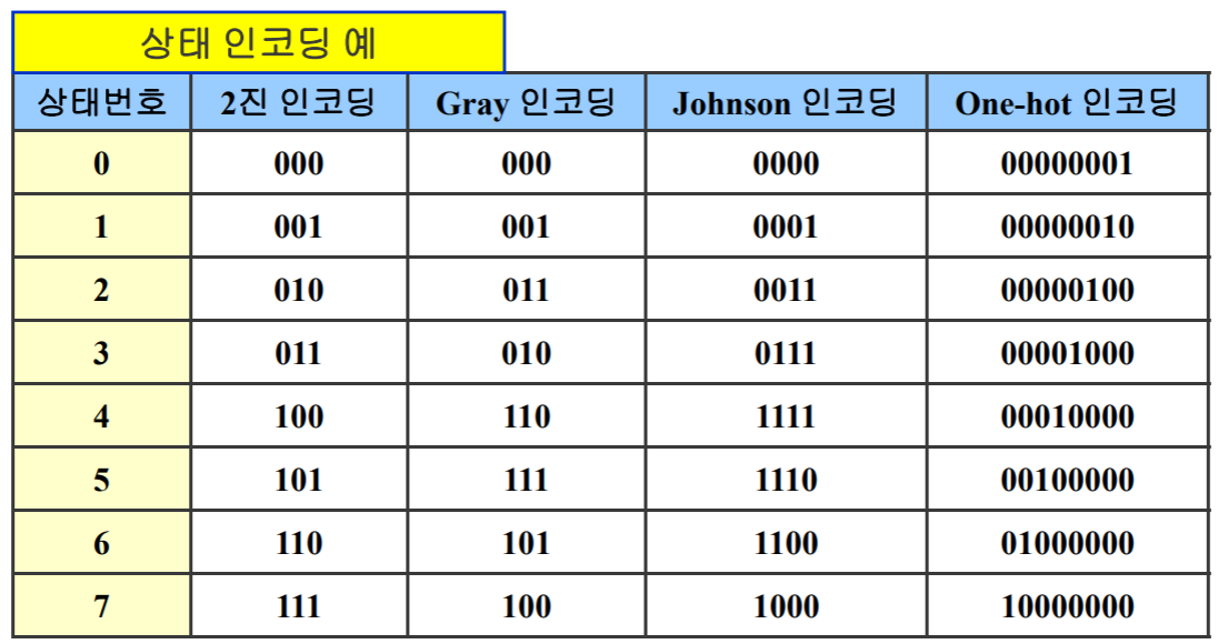 FSM의 상태레지스터는 상태값을 이진(binary)데이터로 저장한다. 이진 데이터의 인코딩 방식에 따라 상태 레지스터의 비트 수가 달라지며, 대표적인 상태 인코딩 방식으로는 이진코드, 그레이코드, 존슨코드, 원핫코드 등이 있다. 8개의 상태를 갖는 경우의 상태 인코딩 형식은 다음과 같다.