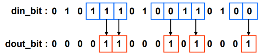 위와 같이 0또는 1이 연속해서 입력되면 1을 출력하는 시퀀스 검출기 회로는 FSM을 이용하여 설계될 수 있다. 비트 단위로 입력되는 din_bit에 00 또는 11의 패턴이 발견되면 1을 출력하고, 그 이외의 경우에는 0을 출력한다.