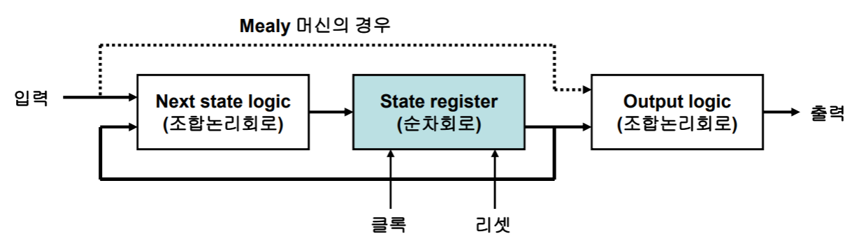 유한상태머신(Finite State Machine)은 지정된 수의 상태를 가지고 상태들 간의 전이에 의해 출력을 생성하는 회로를 총칭하며, 디지털 시스템의 제어회로 구성에 폭넓게 사용된다. FSM의 일반적인 구조는 밑의 그림과 같고, 입력과 현재상태에 따라 다음상태를 결정하는 블록(next state logic), 현재상태를 저장하는 순차회로 블록(state register), 입력과 현재상태에 따라 출력값을 결정하는 블록(output logic)등으로 구성된다.