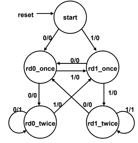 3. rd1_once 상태 : 0이 입력되면 rd0_once상태로 전이되고 출력은 0이 되며, 1이 입력되면 1이 연속해서 입력된 것이므로 rd1_twice상태로 전이되고 출력은 1이 된다.