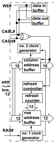 위는 FDM DRAM디바이스에서 데이터의 이동과 감지를 위한 시그널의 타이밍과 순서를 컨트롤하고 만들어내는 컨트롤 로직을 보여줍니다. FDM DRAM의 컨트롤 로직은 비동기로 외부의 컨트롤 시그널을 받아들이고, 내부의 컨트롤 시그널의 순서를 만들어냅니다. 필수적으로 3가지 시그널을 포함하는데, RAS, CAS, WE입니다. FDM DRAM은 16비트 데이터 버스를 가지고 있으며 분리된 CASL과 CASH 시그널의 사용은 DRAM디바이스가 각각 16비트 데이터 버스의 절반을 컨트롤하게 합니다.
