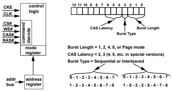 버스트 타입의 값은 SDRAM 디바이스가 어떤 순서로 데이터를 출력하는지를 결정하고, 버스트 길이는 SDRAM디바이스가 한 개의 column read command에 대해 메모리 컨트롤러로 출력시키는 column의 수를 결정합니다. SDRAM 느 1,2,4,8혹은 전체 row를 출력시킬 수 있게 프로그램되어 있습니다.