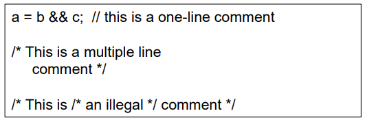주석은 가독성과 문서화를 위해 코드에 들어간다. 주석을 사용하는 방법은 두가지가 있다. 한 줄 주석은 //로 시작하고, 여러줄 주석은 /*로시작해 */로 끝난다.