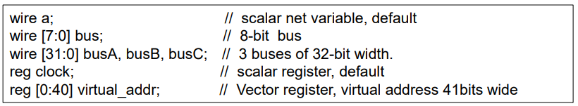 넷과 reg데이터형은 벡터(여러 비트폭을 가진)로 선언될 수 있다. 만약 폭이 선언되어 있지 않으면 기본값은 스칼라(1bit)이다.